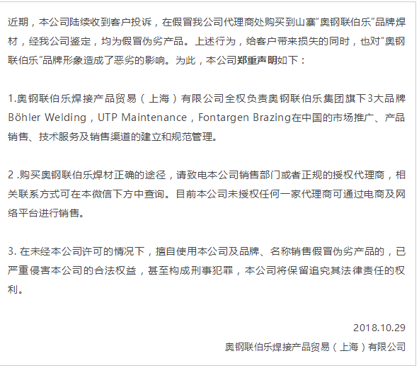再次感謝用戶(hù)朋友對(duì)奧鋼聯(lián)伯樂(lè)焊接長(zhǎng)久以來(lái)的信任與支持,請(qǐng)通過(guò)正規(guī)途徑購(gòu)買(mǎi)奧鋼聯(lián)伯樂(lè)焊材!