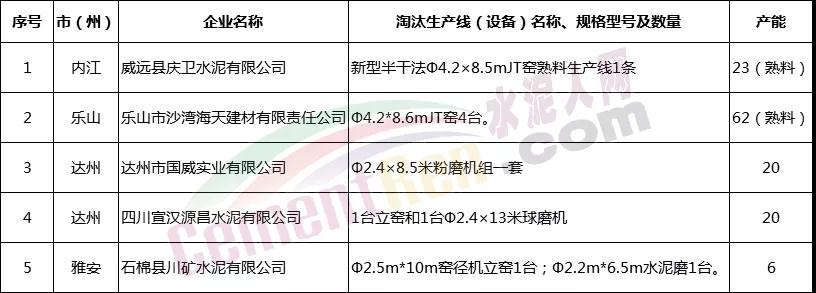 五家水泥企業(yè)分別為威遠(yuǎn)縣慶衛(wèi)水泥有限公司、樂(lè)山市沙灣海天建材有限責(zé)任公司、達(dá)州市國(guó)威實(shí)業(yè)有限公司、四川宣漢源昌水泥有限公司、石棉縣川礦水泥有限公司。其中涉及熟料產(chǎn)能85萬(wàn)噸,水泥產(chǎn)能46萬(wàn)噸。