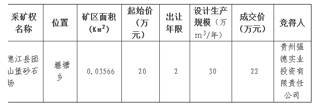 根據(jù)《中華人民共和國礦產(chǎn)資源法》、《貴州省礦業(yè)權(quán)招標拍賣掛牌出讓暫行辦法》,銅仁市公共資源交易中心德江分中心于2018年10月17日 至 2018年10月30日16時,對德江縣團山堡砂石場采礦權(quán)進行了公開掛牌出讓,現(xiàn)將掛牌出讓結(jié)果公示如下: