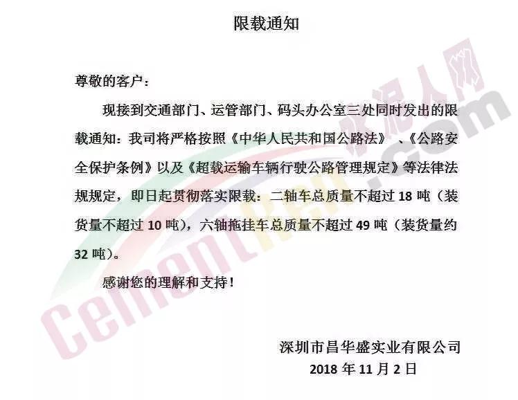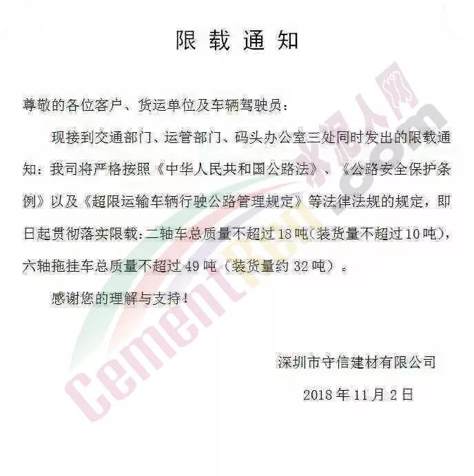 接到通知后,深圳市各區(qū)域建材相關(guān)企業(yè)紛紛下發(fā)通知,稱嚴格執(zhí)行相關(guān)文件要求。深圳市守信建材有限公司、深圳市昌華盛實業(yè)有限公司等企業(yè)發(fā)布限載通知稱,接到交通部門、運管部門、碼頭辦公室三處同時發(fā)出的限載通知。公司將嚴格按照《中華人民共和國公路法》、《公路安全保護條例》以及《超限運輸車輛行駛公路管理規(guī)定》等法律法規(guī)的規(guī)定,即日起貫徹落實限載:二軸車總質(zhì)量不超過18噸(裝貨量不超過10噸),六軸拖掛車總質(zhì)量不超過49噸(裝貨量約32噸)。原文如下: