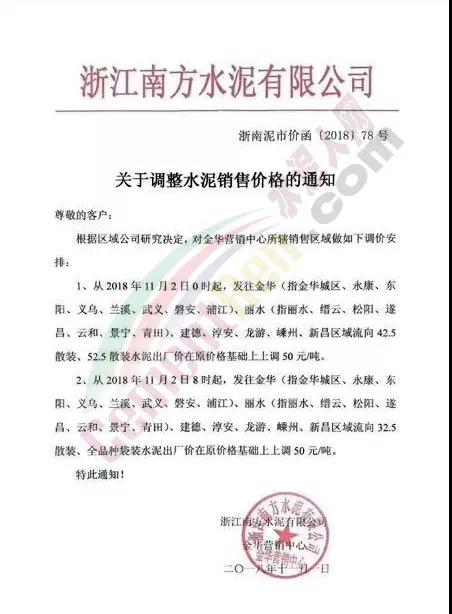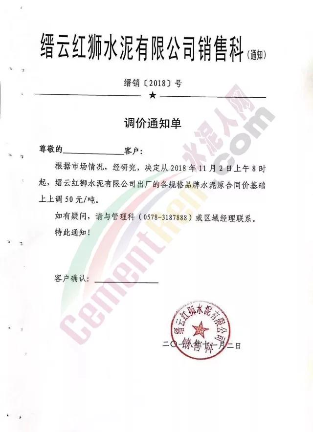 根據(jù)當(dāng)前錯峰生產(chǎn)、市場行情及原材料價格上漲情況,經(jīng)公司研究決定,自2018年11月2日上午8時起,對PC32.5袋裝及散裝價格上調(diào)30元/噸;PO42.5袋、散裝、緩凝及52.5袋、散上調(diào)50元/噸。