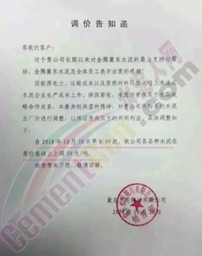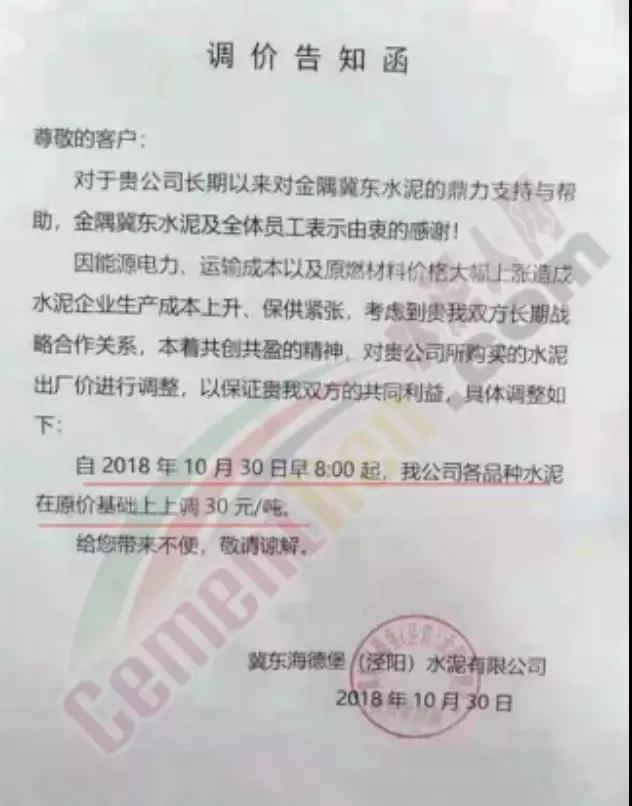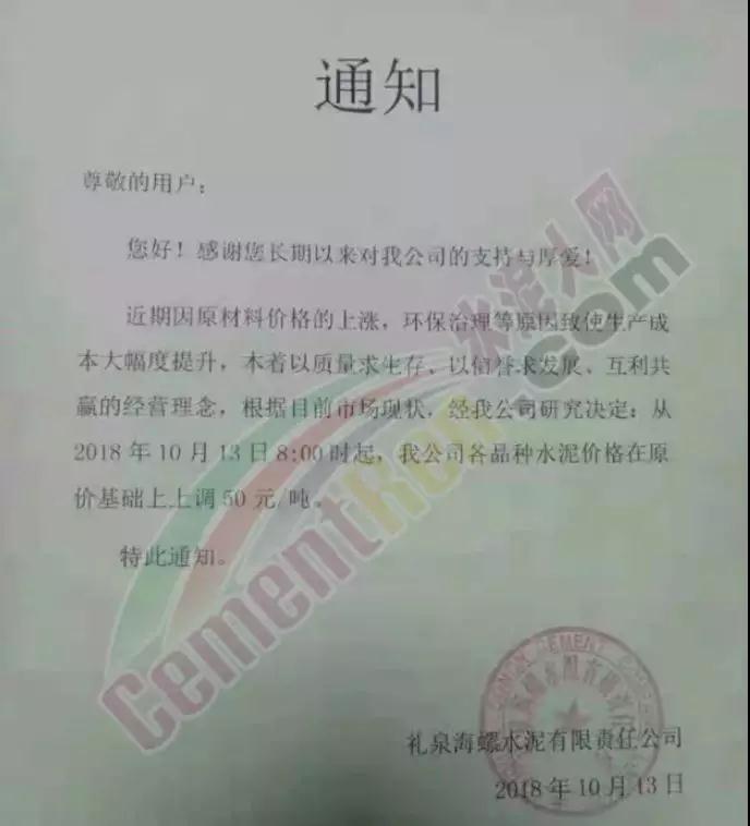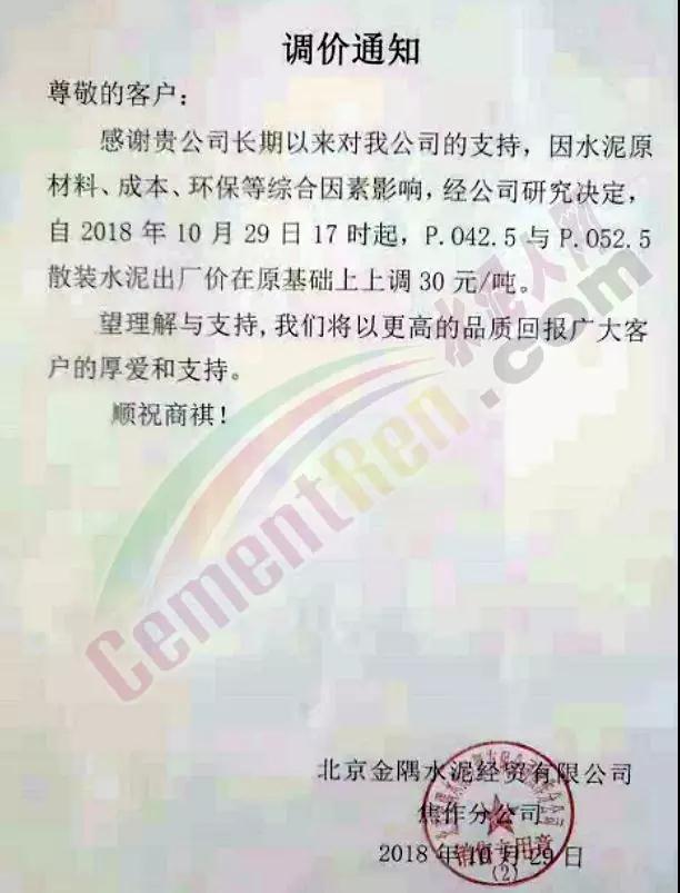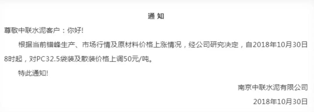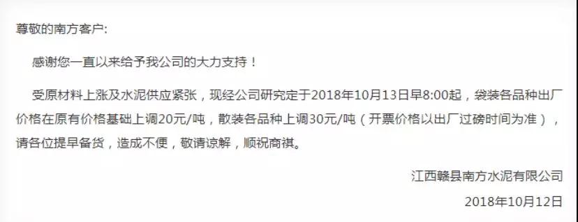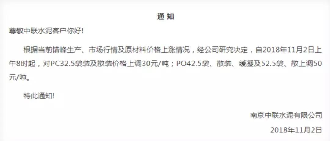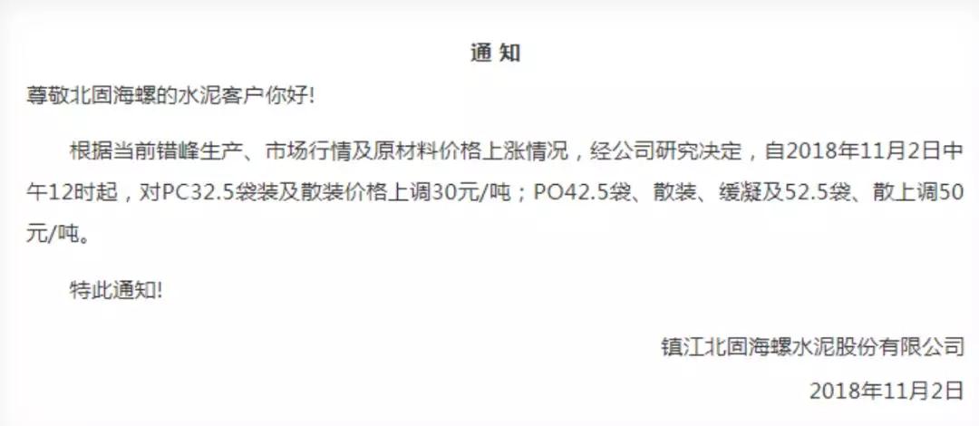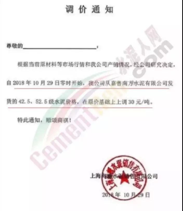 10月29日上海海螺水泥銷售有限公司發(fā)了一份南方水泥的漲價通知,漲價函稱經(jīng)公司研究決定自10月29日零時開始,公司從嘉善南方水泥發(fā)貨的42.5、52.5級水泥價格,在原價基礎(chǔ)上上調(diào)30元/噸。