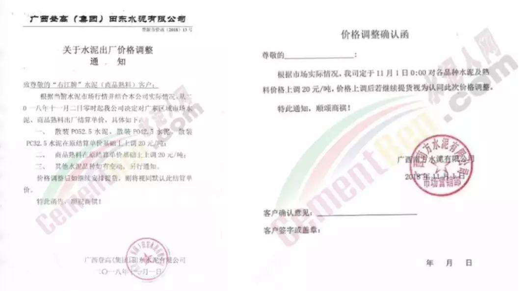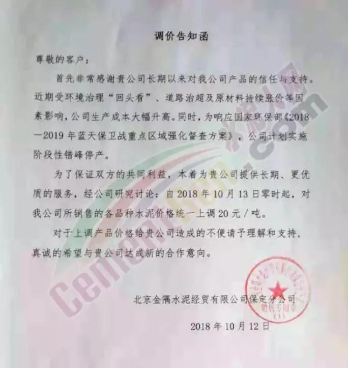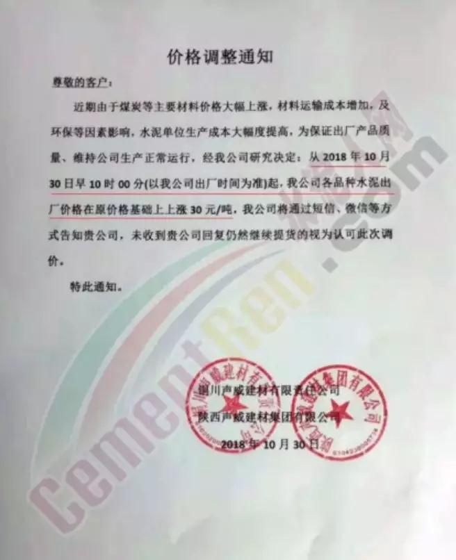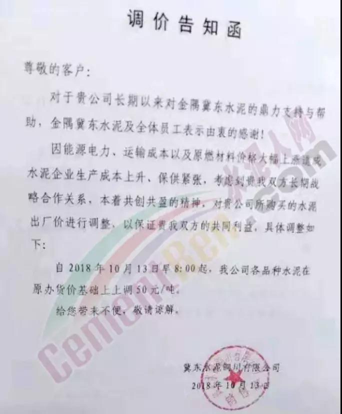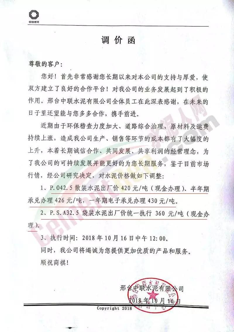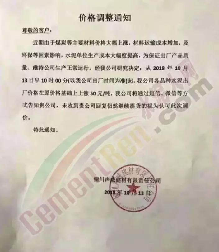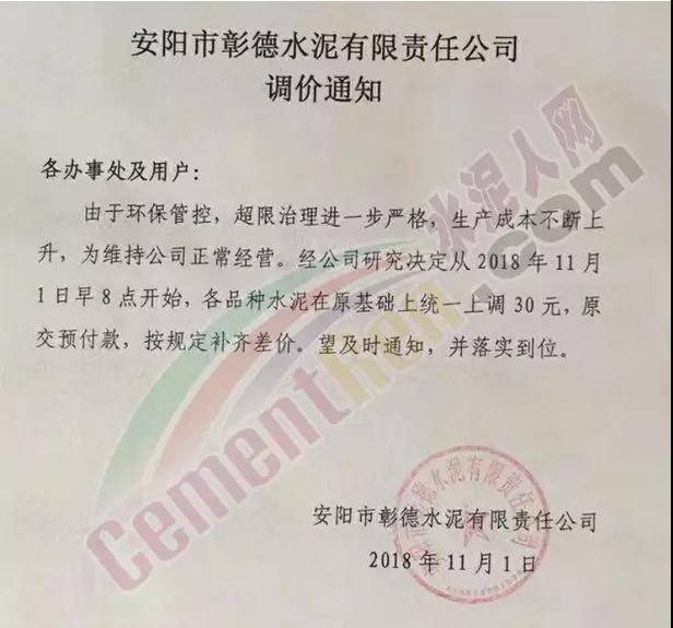 10月29日上海海螺水泥銷售有限公司發(fā)了一份南方水泥的漲價通知,漲價函稱經(jīng)公司研究決定自10月29日零時開始,公司從嘉善南方水泥發(fā)貨的42.5、52.5級水泥價格,在原價基礎(chǔ)上上調(diào)30元/噸。