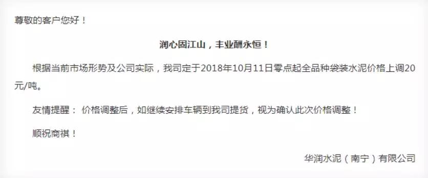 10月11日興業(yè)海螺、扶綏海螺、南寧紅獅、南寧華潤、貴港臺泥等企業(yè)統(tǒng)一發(fā)布漲價通知,漲價幅度20元/噸。