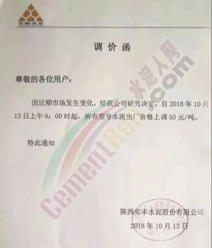 陜西關(guān)中區(qū)域水泥企業(yè)自10月以來已經(jīng)經(jīng)歷了至少兩次漲價,10月13日關(guān)中區(qū)域的海螺水泥、堯柏水泥、冀東水泥等通知各標(biāo)號水泥在原價基礎(chǔ)上上調(diào)50元/噸。
