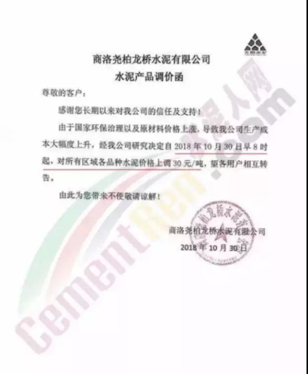 11月3日山西長治市主導(dǎo)企業(yè)通知自11月4日凌晨起上調(diào)各標(biāo)號水泥價格,其中32.5級水泥上調(diào)30元/噸,42.5水泥上調(diào)40元/噸。調(diào)價通知如下: