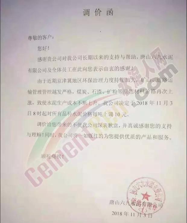 11月3日六九水泥發(fā)通知稱,由于近期京津冀地區(qū)環(huán)保治理力度持續(xù)加大,礦山、道路運(yùn)輸管理管控越發(fā)嚴(yán)格,煤炭、石渣、礦粉等原燃材料價格再次上漲,致使企業(yè)生產(chǎn)成本不斷上升,公司決定自11月3日起對所有品種水泥價格上調(diào)10元/噸。