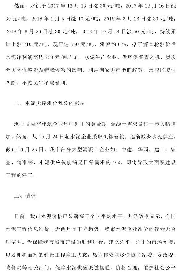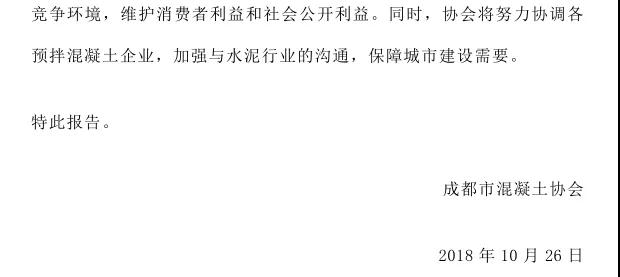 除此之外,成都市混凝土協(xié)會發(fā)布《關于近期水泥無序漲價亂象影響我市建設工程混凝土供應的緊急報告》,該文件指出成都市水泥價格持續(xù)上漲,已經(jīng)嚴重影響到了民生,懇請建委能盡快協(xié)調(diào)經(jīng)委、發(fā)改委、物價局等相關部門,保障水泥供應渠道暢通、價格合理,維護社會公平競爭環(huán)境,維護消費者利益和社會公開利益。