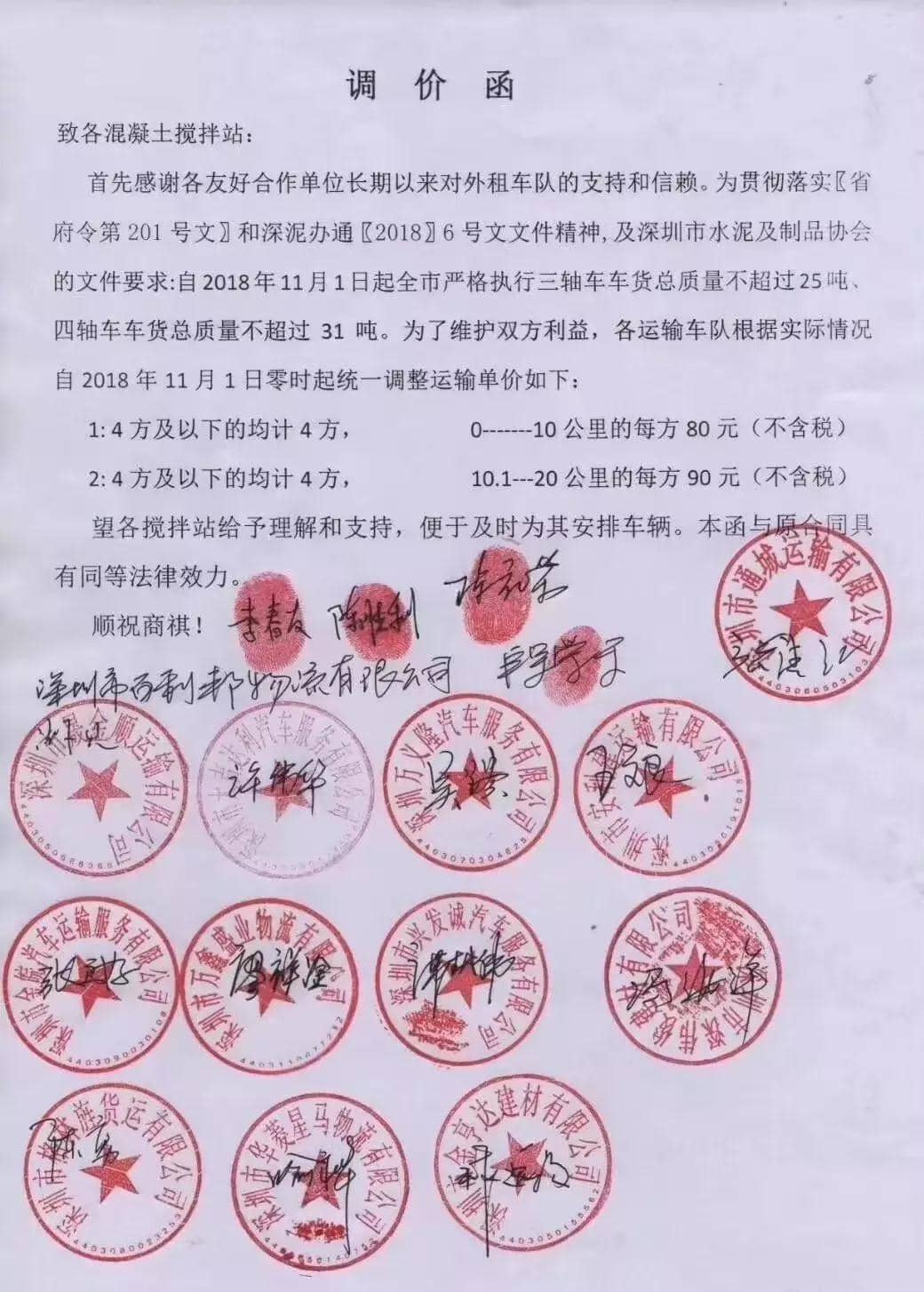 深圳市17家物流運輸公司聯(lián)名發(fā)布漲價通知稱:因為目前深圳市將嚴格執(zhí)行三軸車車貨總質量不超25噸、四軸車車貨總質量不超31噸。因此,將運輸單價做如下調(diào)整: