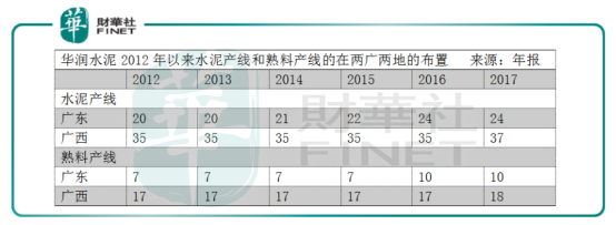 類似于海螺水泥在長江沿岸、華東地區(qū)的T型戰(zhàn)略,華潤水泥也同樣通過運用廣西地區(qū)較廣東更為豐富的石灰石和煤炭資源,輔之以西江水路運輸?shù)谋憷?,為廣東市場輸血,該戰(zhàn)略能從華潤水泥在兩廣的生產(chǎn)線布置中領(lǐng)略一二。2017年,華潤水泥在廣西設(shè)有18條熟料生產(chǎn)線,37條水泥生產(chǎn)線,對應(yīng)產(chǎn)能2650萬噸、3320萬噸;而廣東分別為10條、24條,對應(yīng)產(chǎn)能1440萬噸、2250萬噸。