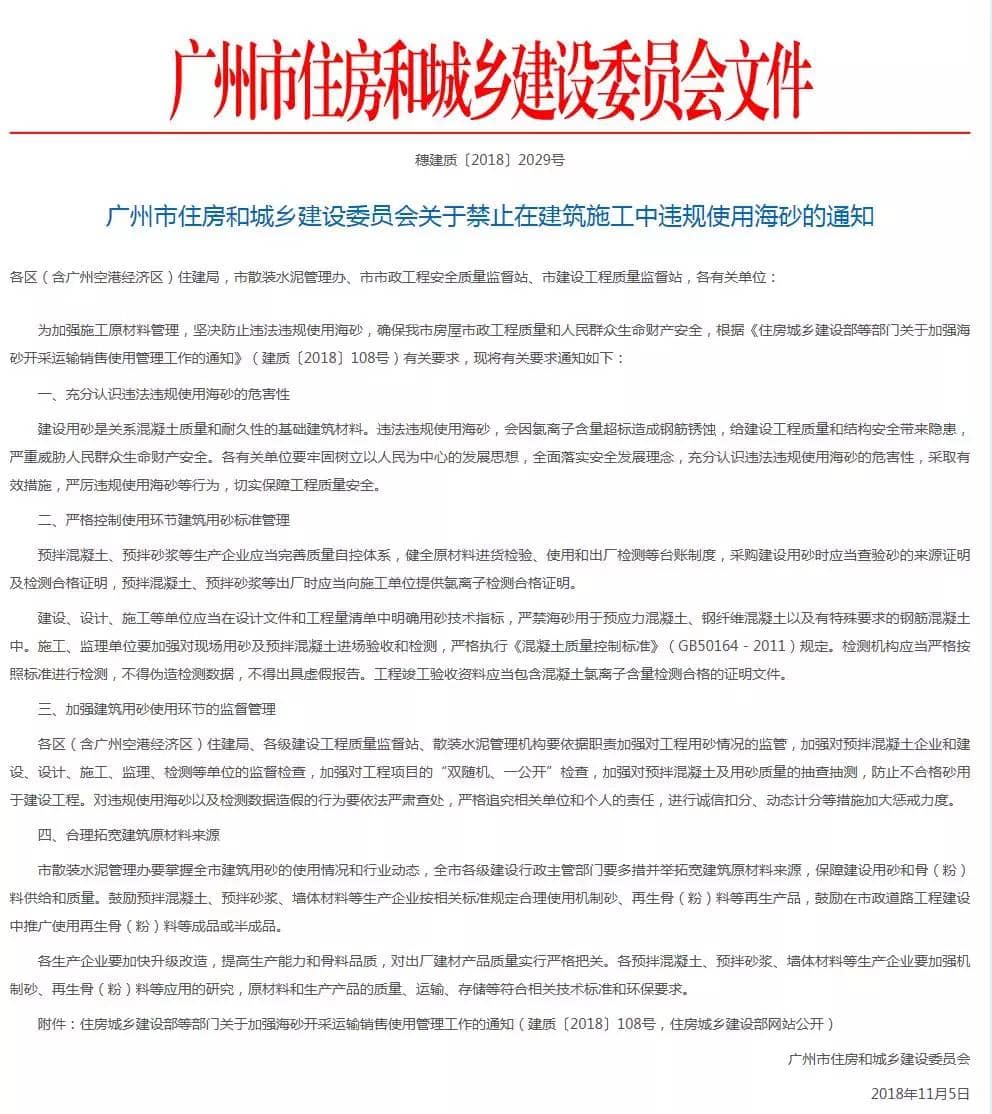 《通知》強(qiáng)調(diào),要加強(qiáng)建筑用砂使用環(huán)節(jié)的監(jiān)督管理,各區(qū)(含廣州空港經(jīng)濟(jì)區(qū))住建局、各級(jí)建設(shè)工程質(zhì)量監(jiān)督站等要加強(qiáng)對(duì)工程用砂情況的監(jiān)管,加強(qiáng)對(duì)預(yù)拌混凝土企業(yè)和建設(shè)、設(shè)計(jì)、施工、監(jiān)理、檢測(cè)等單位的監(jiān)督檢查,加強(qiáng)對(duì)預(yù)拌混凝土及用砂質(zhì)量的抽查抽測(cè),防止不合格砂用于建設(shè)工程。