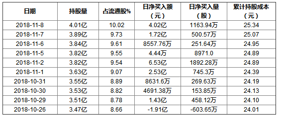 同花順(300033)數(shù)據(jù)顯示,2018年11月8日,海螺水泥(600585)獲外資買入1163.94萬股,占流通盤0.29%,上榜陸股通日增倉前十。截至目前,陸股通持有海螺水泥4.01億股,占流通股10.02%,平均買入成本25.34元,持股盈利36.32%。