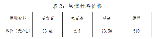 4.5電石渣制水泥相比石灰石制水泥能耗降低、成本減少。就我廠目前使用的原燃材料價(jià)格情況,如表2所示: