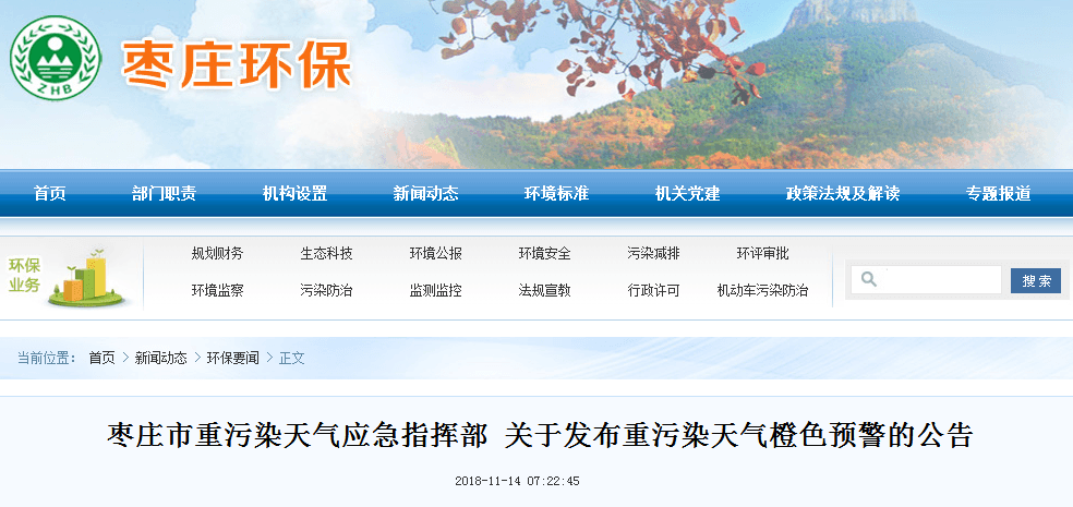 按照生態(tài)環(huán)境部統(tǒng)一部署,棗莊市重污染天氣應(yīng)急指揮部依據(jù)《棗莊市重污染天氣應(yīng)急預(yù)案(2018年修訂)》(棗氣綜指〔2018〕16號),于2018年11月14日7時(shí)發(fā)布重污染天氣橙色預(yù)警,定于2018年11月14日8時(shí)啟動(dòng)重污染天氣Ⅱ級應(yīng)急響應(yīng)。