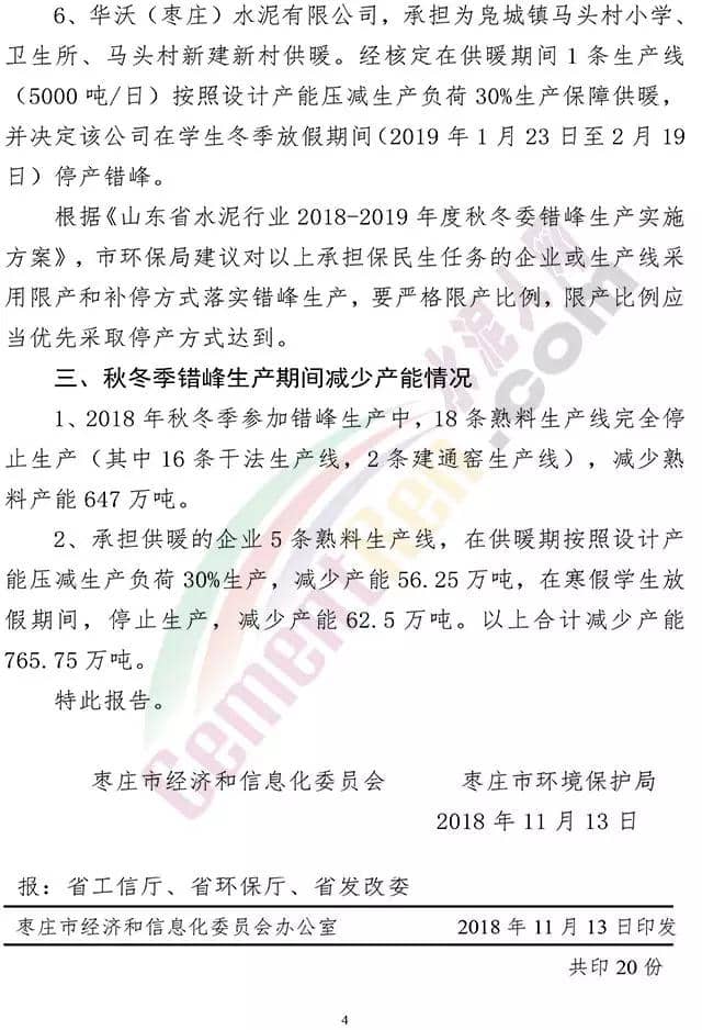 4、山東聯(lián)合王晁水泥有限公司,承擔澗頭集頓東村小學冬季取暖,經核定在供暖期間1條生產線(5000噸/日)按照設計產能壓減生產負荷30%生產保障供暖,并決定該公司在學生冬季放假期間(2019年1月23日至2月19日)停產錯峰。