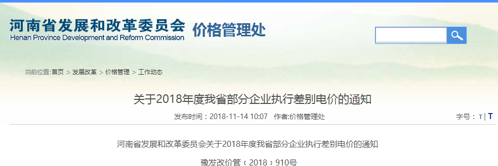 五、各地價格主管部門要會同有關(guān)部門按照省政府辦公廳《關(guān)于完善差別化電價政策的通知》(豫政辦明電〔2018〕99號)等文件要求,加強(qiáng)對差別化電價的核查、執(zhí)行和監(jiān)督檢查,確保差別化電價政策落實到位。省電力公司要將本次差別電價執(zhí)行情況于2019年2月底前報送我委(價管處)。