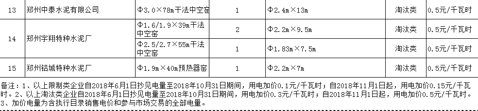 三、鄭州中泰水泥有限公司等9家企業(yè)的部分生產(chǎn)設(shè)施屬淘汰類項目(見附表),自2018年6月1日抄見電量至2018年10月31日期間,用電加價0.3元/千瓦時;自2018年11月1日起,用電加價0.5元/千瓦時。