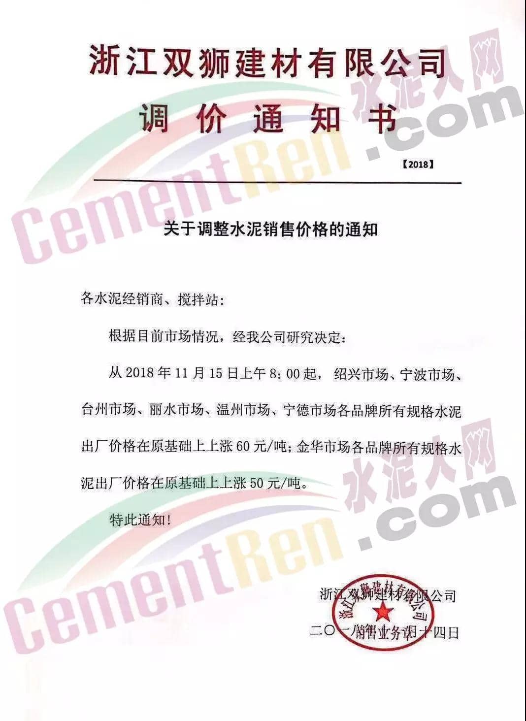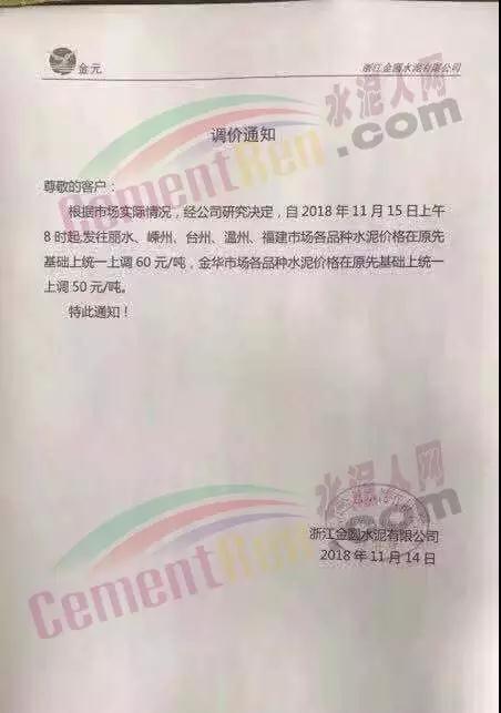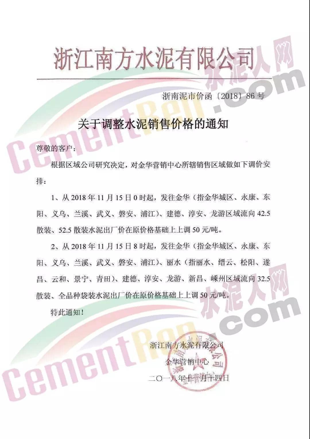 浙江南方水泥有限公司發(fā)布漲價(jià)通知稱,自2018年11月15日0時(shí)起,發(fā)往金華、建德、淳安、龍游區(qū)域流向42.5散裝、52.5散裝水泥出廠價(jià)在原價(jià)格基礎(chǔ)上上調(diào)50元/噸。