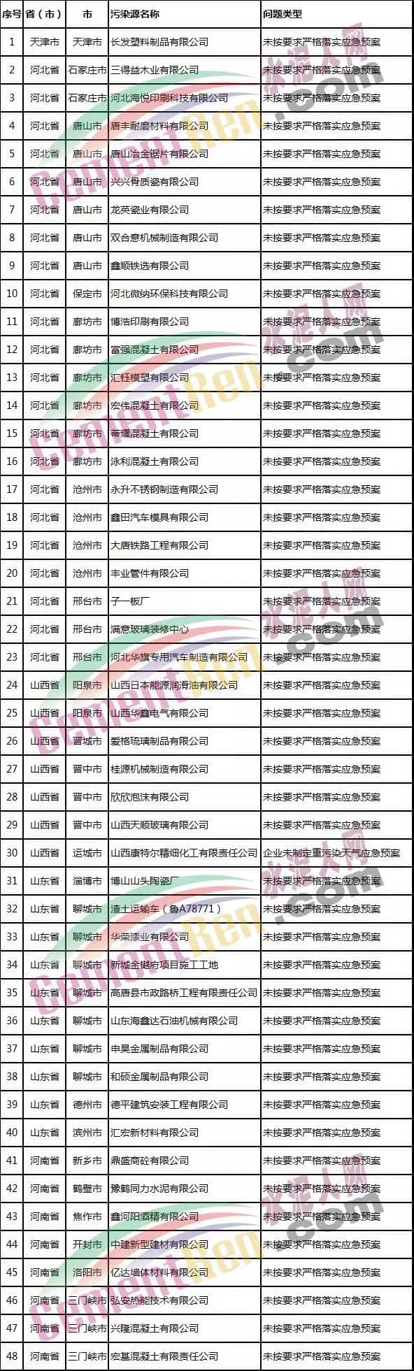 11月15日,2018-2019年藍(lán)天保衛(wèi)戰(zhàn)重點(diǎn)區(qū)域強(qiáng)化監(jiān)督工作組共檢查啟動(dòng)重污染天氣應(yīng)急響應(yīng)城市1785家企業(yè)(點(diǎn)位),發(fā)現(xiàn)有48家企業(yè)(點(diǎn)位)未嚴(yán)格執(zhí)行重污染天氣應(yīng)急響應(yīng)要求(見(jiàn)附件)。