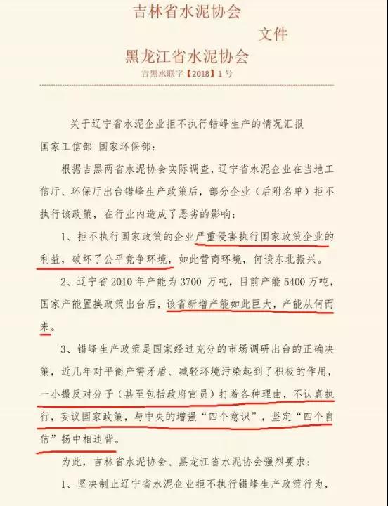 遼寧地區(qū)十幾家水泥企業(yè)拒不執(zhí)行錯峰生產(chǎn),引起了吉林省水泥協(xié)會和黑龍江省水泥協(xié)會的強烈譴責(zé)。吉林省水泥協(xié)會和黑龍江省水泥協(xié)會聯(lián)合發(fā)布【關(guān)于遼寧省水泥企業(yè)拒不執(zhí)行錯峰生產(chǎn)的情況匯報】1號文件,將這一情況向國家工信部、國家環(huán)保部進行了匯報。