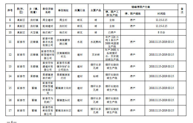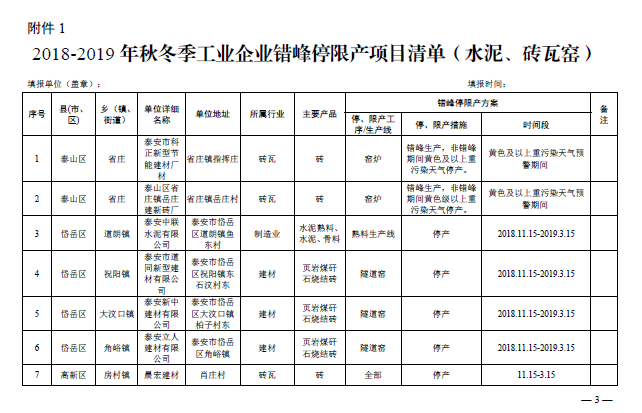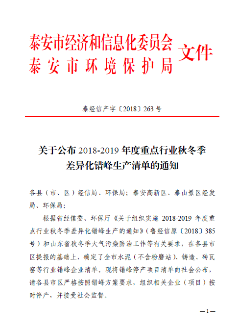 近日,泰安市經(jīng)濟(jì)和信息化委員會(huì)和泰安市環(huán)境保護(hù)局聯(lián)合發(fā)布《關(guān)于公布2018-2019年度重點(diǎn)行業(yè)秋冬季差異化錯(cuò)峰生產(chǎn)清單》的通知,據(jù)悉,在各縣市區(qū)提報(bào)的基礎(chǔ)上,確定了全市水泥(不含粉磨站)、鑄造、磚瓦窯等行業(yè)錯(cuò)峰企業(yè)清單。錯(cuò)峰停產(chǎn)項(xiàng)目清單將向社會(huì)公布,要求各縣市區(qū)嚴(yán)格按照錯(cuò)峰方案要求,組織相關(guān)企業(yè)(項(xiàng)目)按時(shí)停產(chǎn),同時(shí)接受社會(huì)監(jiān)督。