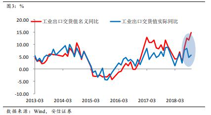 這與市場的感官認知有一定的差異,也與之前一路下降的走勢不一致。我們認為,7-10月出口出現(xiàn)了明顯的反彈,支撐了7-10月的工業(yè)生產(chǎn)。由于人民幣貶值,出口名義值反彈明顯;但即使從實際值看,7-10月的工業(yè)出口實際增速為6.6%,比3-6月的3.5%多增了3%;如果按照出口占工業(yè)生產(chǎn)的30%粗略估計,這四個月出口的回升拉升了工業(yè)增加值增速將近一個百分點。