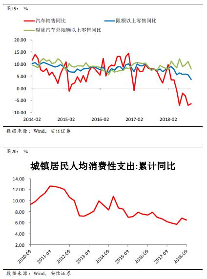今年以來社會消費品零售總額和限額以上零售同比下滑明顯,很大程度上是受到汽車銷售大幅下滑的影響。如果剔除汽車部分,限額以上零售的其他部分同比增速甚至略有上行。但10月汽車銷售跌幅收窄,同時限額以上零售增速明顯放緩,使得去除汽車的其他消費出現(xiàn)了下滑。但這個下滑是否持續(xù)還需要進一步觀察。另外,從城鎮(zhèn)居民人均消費支出這個指標上看,暫時沒有明顯看到消費有大幅下滑的跡象。