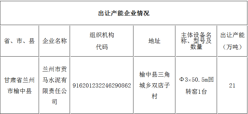 按照《國(guó)務(wù)院關(guān)于化解產(chǎn)能嚴(yán)重過剩矛盾的指導(dǎo)意見》(國(guó)發(fā)〔2013〕41號(hào))、《工業(yè)和信息化部關(guān)于印發(fā)鋼鐵水泥玻璃行業(yè)產(chǎn)能置換實(shí)施辦法的通知》(工信部產(chǎn)業(yè)〔2017〕337號(hào))和《甘肅省工業(yè)和信息化委員會(huì)關(guān)于做好鋼鐵水泥等行業(yè)產(chǎn)能置換工作的通知》(甘工信發(fā)〔2018〕241號(hào))要求,現(xiàn)將蘭州市貢馬水泥有限責(zé)任公司水泥熟料產(chǎn)能出讓情況予以公示,歡迎社會(huì)公眾進(jìn)行監(jiān)督。