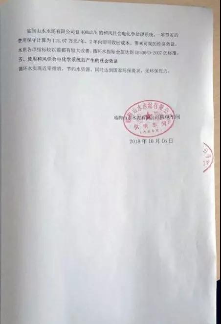 四、綜上,臨朐山水水泥有限公司自使用400m³/h的和風(fēng)佳會電化學(xué)處理系統(tǒng),一年節(jié)省的費(fèi)用約為76.76萬元/年,帶來可觀的經(jīng)濟(jì)效益。水質(zhì)各項(xiàng)指標(biāo)較以前都有較大改善,循環(huán)水指標(biāo)全部達(dá)到GB50050-2007的標(biāo)準(zhǔn)。