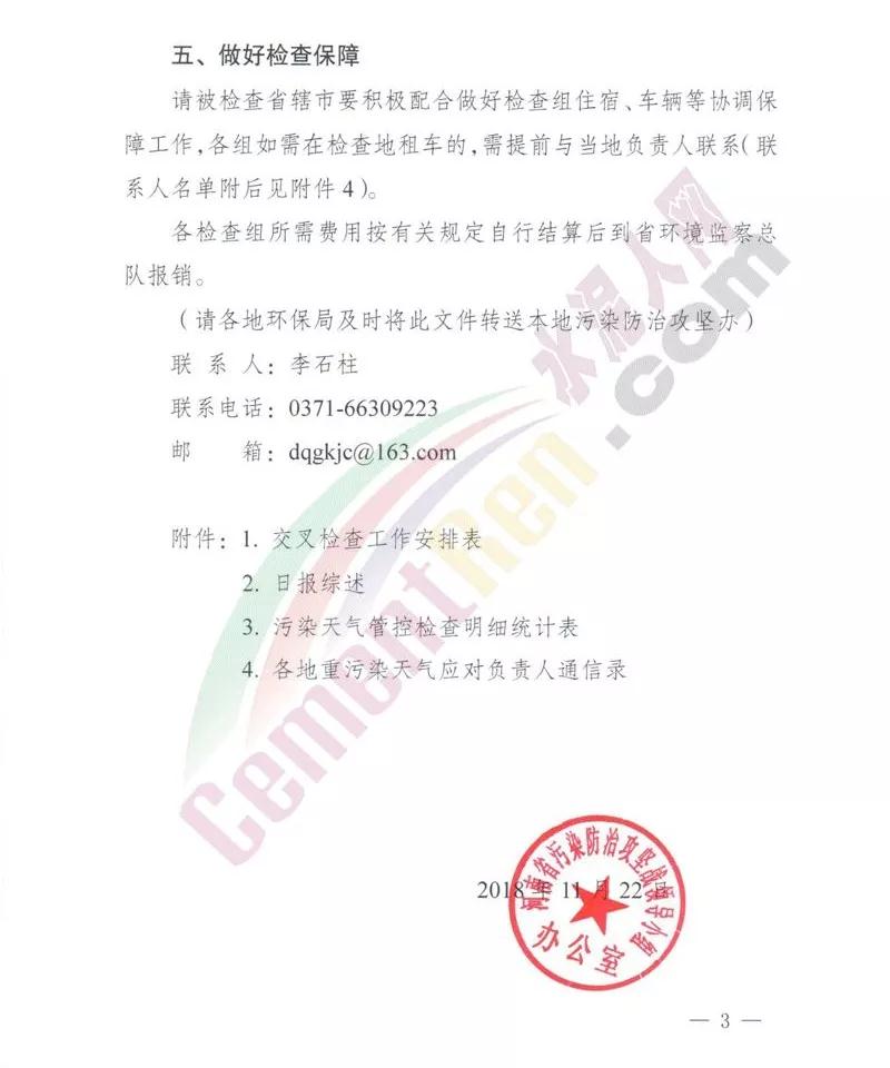 水泥人網(wǎng)最新消息,昨日(22日)河南省污染防治攻堅戰(zhàn)領(lǐng)導(dǎo)小組辦公室發(fā)布《關(guān)于加強重污染天氣應(yīng)急管控及開展第一輪交叉檢查工作的通知》(豫環(huán)攻堅辦【2018】56號文件。文件稱,根據(jù)河南省環(huán)境監(jiān)測中心最新天氣形勢分析及多部門會商研判,11月23日至25日河南省沒有持續(xù)較好的大氣擴散條件,北部及京廣線沿線以東區(qū)域有持續(xù)輕中度污染過程,預(yù)測鄭州、開封、平頂山、安陽、鶴壁、新鄉(xiāng)、焦作、濮陽、許昌、商丘等10個省轄市將出現(xiàn)重度污染過程;28日至30日全省還將出現(xiàn)一個污染過程。