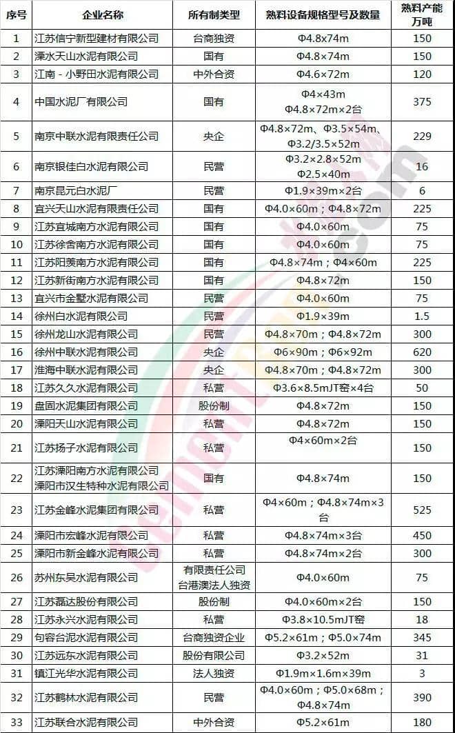 江蘇省部分水泥企業(yè)名單