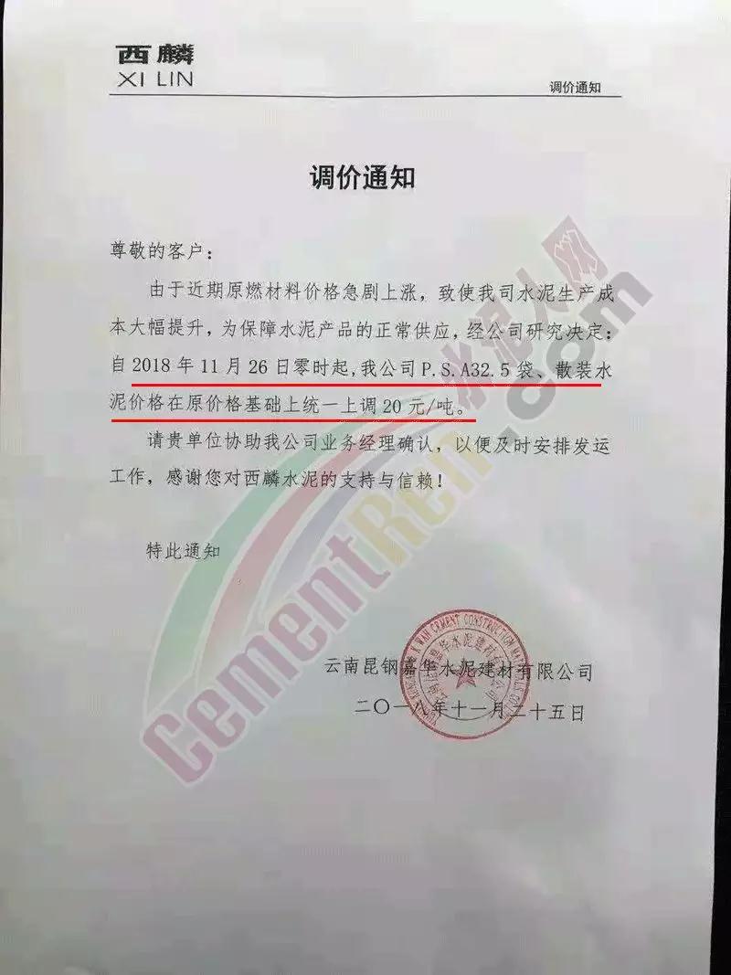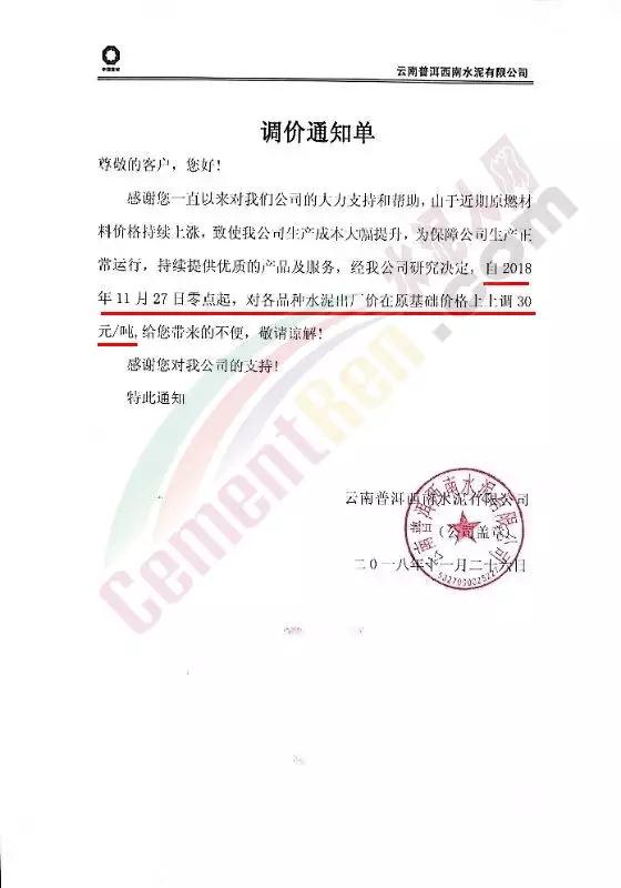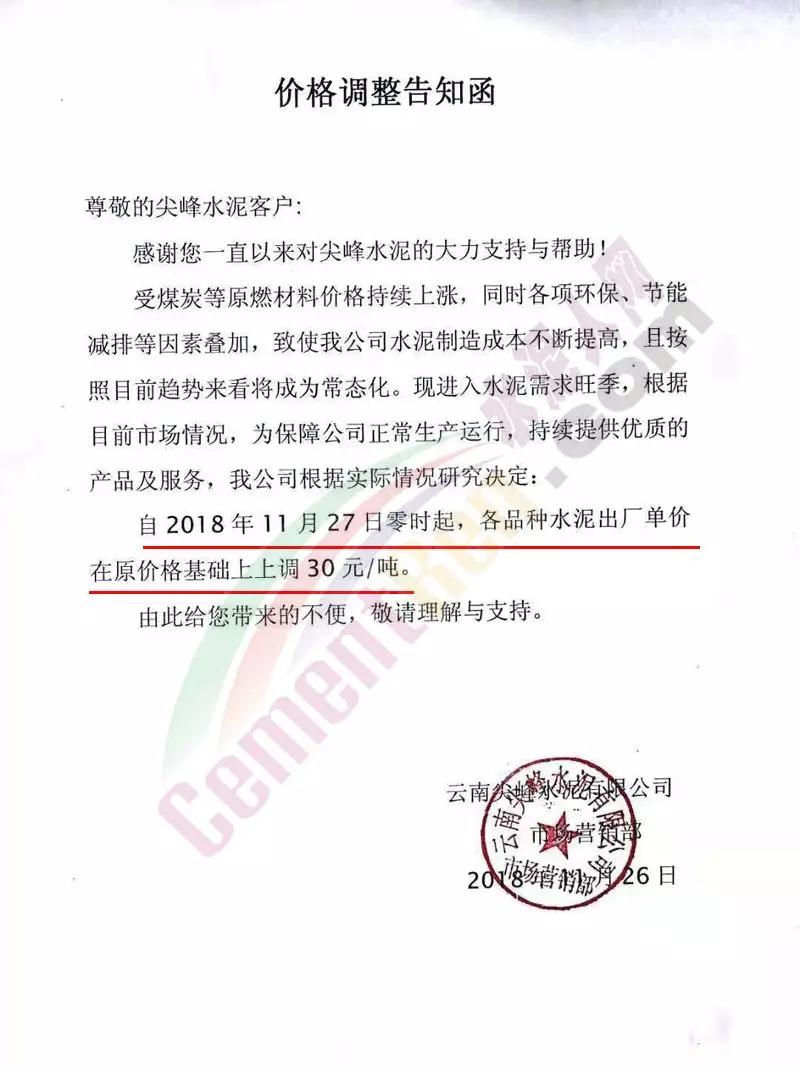 云南尖峰水泥有限公司價格調(diào)整告知函稱,受煤炭等原燃材料價格持續(xù)上漲,同時各項環(huán)保、節(jié)能減排等因素疊加,致使公司水泥制造成本不斷提高,且按照目前趨勢來看將成為常態(tài)化?,F(xiàn)進(jìn)入水泥需求旺季,根據(jù)目前市場情況,為保障公司正常生產(chǎn)運行,持續(xù)提供優(yōu)質(zhì)的產(chǎn)品及服務(wù),公司根據(jù)實際情況研究決定自今日(27日)零時起,各品種水泥出廠單價在原價格基礎(chǔ)上上調(diào)30元/噸。