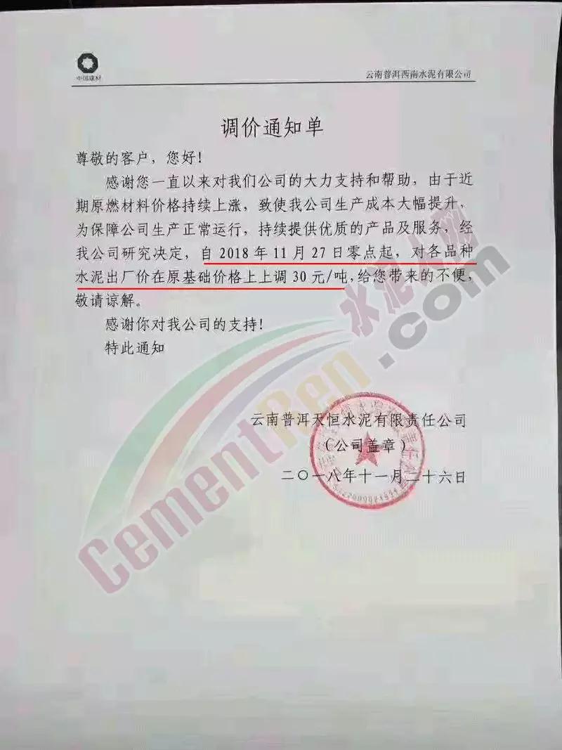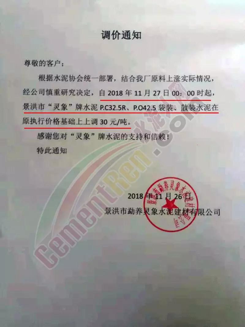 同期云南瀾滄三環(huán)建材有限公司和景洪市勐養(yǎng)靈象水泥建材有限公司也同步上調(diào)了水泥價格。調(diào)價通知如下: