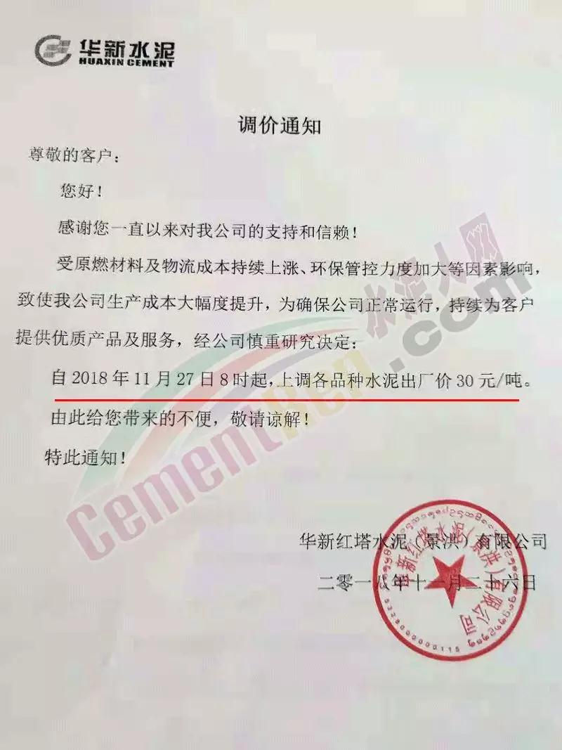 華新紅塔水泥(景洪)有限公司調(diào)價通知稱,受原燃材料及物流成本持續(xù)上漲,環(huán)保管控力度加大等因素影響,致使公司生產(chǎn)成本大幅提升,為確保公司正常運行,持續(xù)為客戶提供 優(yōu)質(zhì)產(chǎn)品及服務(wù),經(jīng)公司慎重研究決定 :自今日(27日)8時起,上調(diào)各品種水泥出廠價30元/噸。