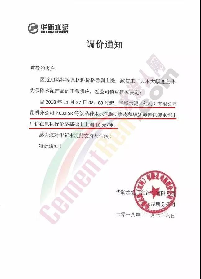 華新水泥(紅河)有限公司昆明分公司調(diào)價通知稱,因近期熟料等原材料價格急劇上漲,致使工廠成本大幅度上升,為保障水泥產(chǎn)品的正常供應(yīng),經(jīng)公司慎重研究決定:自今日(27日)早8時起,公司P.C32.5等級品種水泥包裝、散裝和華新師傅包裝水泥出廠價在原執(zhí)行價格基礎(chǔ)上上調(diào)10元/噸。