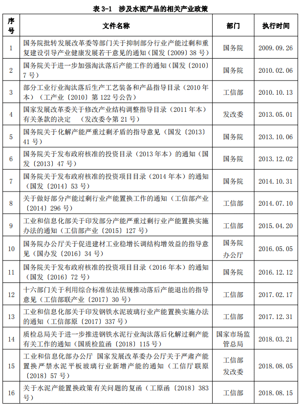 涉及水泥產(chǎn)品的相關(guān)產(chǎn)業(yè)政策見表3-1。