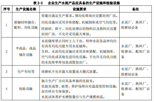 第七條 企業(yè)生產(chǎn)水泥產(chǎn)品應(yīng)具備本條款規(guī)定的基本生產(chǎn)條件,內(nèi)容包括:生產(chǎn)設(shè)施和檢驗(yàn)設(shè)施、生產(chǎn)設(shè)備和檢驗(yàn)設(shè)備,具體要求見表3-2至表3-4。