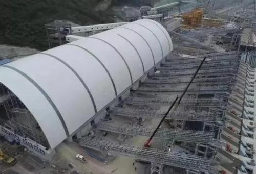 此外,這里安裝了單機(jī)處理能力達(dá)2000噸每小時(shí)的破碎設(shè)備和625噸每小時(shí)的篩分設(shè)備,有輸送能力達(dá)13000噸每小時(shí)的帶式輸送線,有重達(dá)73噸的單榀桁架和403噸的單座轉(zhuǎn)運(yùn)站,有高40米、跨度110米、容量達(dá)80萬立方米的全封閉骨料倉(cāng)等。