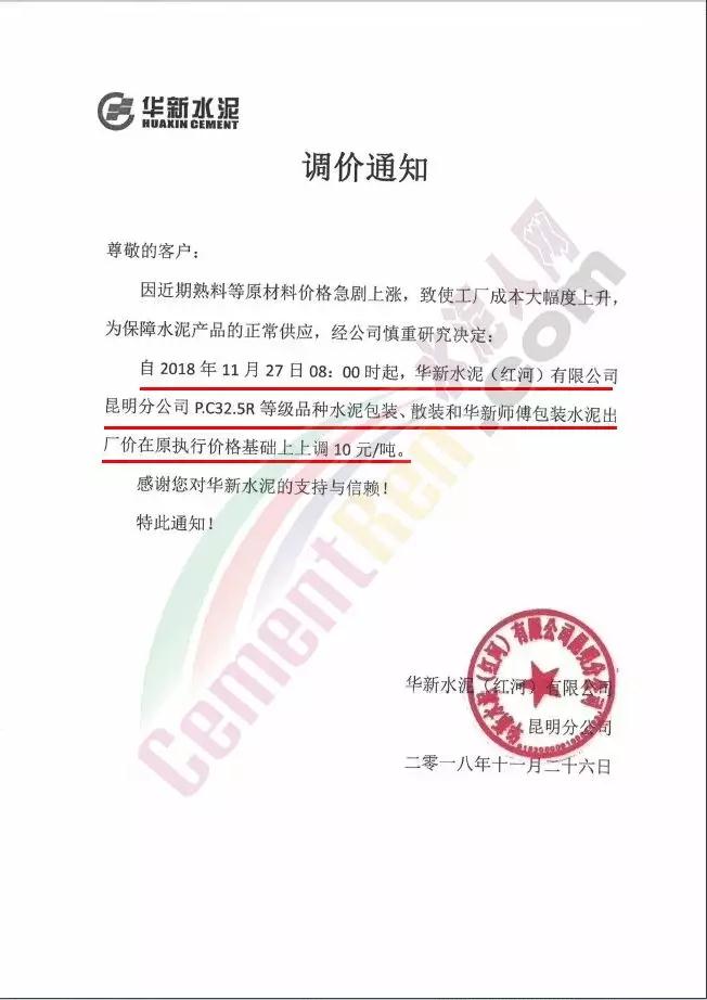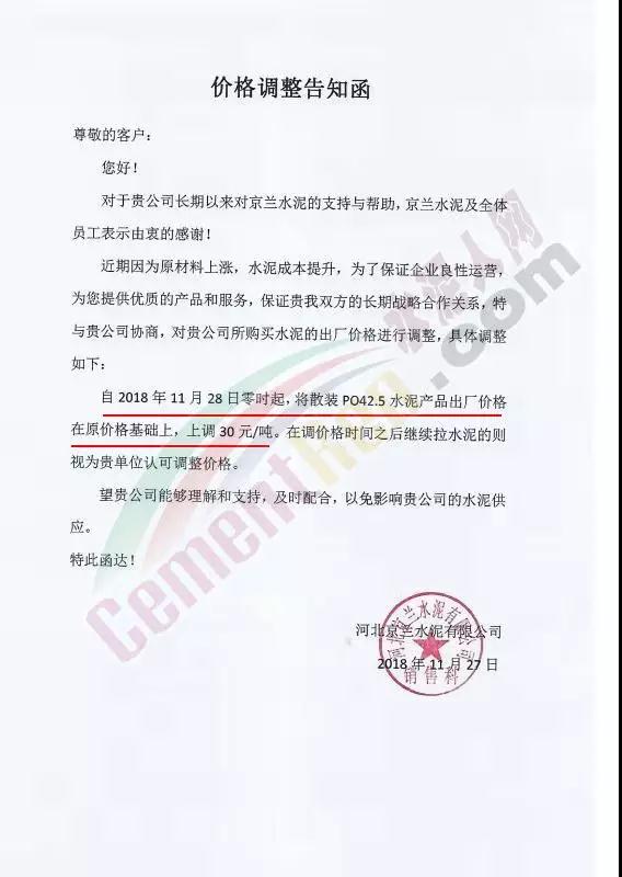 近兩日京津冀地區(qū)又迎來一波漲價潮。區(qū)域主導企業(yè)金隅水泥經(jīng)貿(mào)公司石家莊、邯鄲、保定等公司陸續(xù)發(fā)布了調(diào)價通知。石家莊區(qū)域京蘭水泥、曲寨水泥等主要品牌亦同期發(fā)通知上調(diào)水泥價格。調(diào)價函如下: