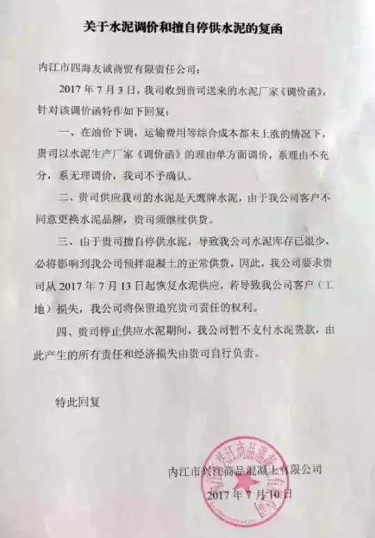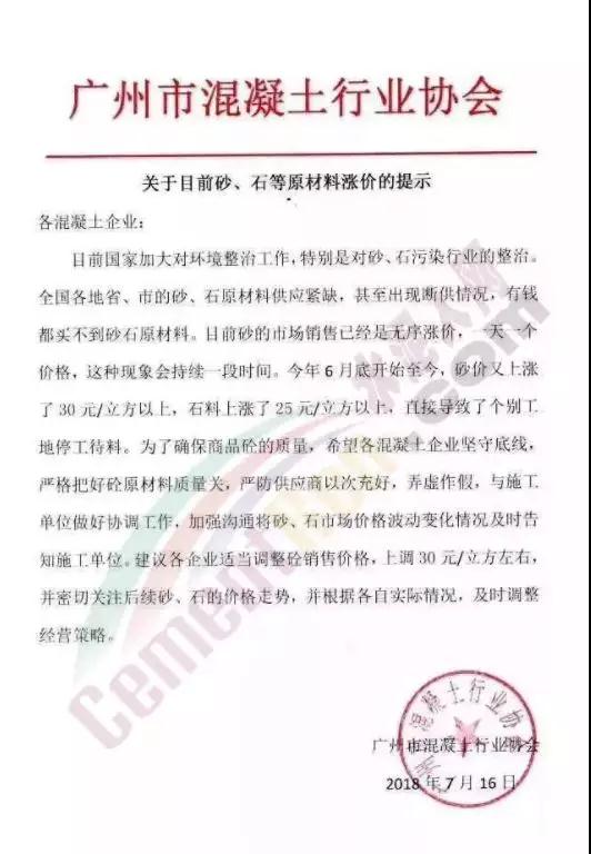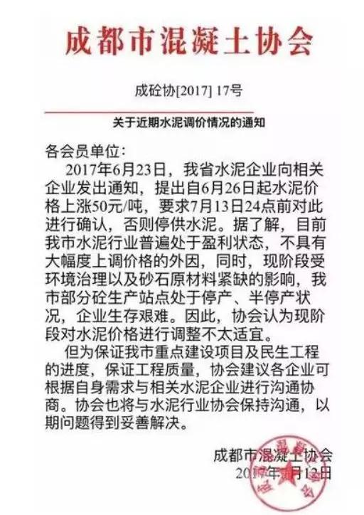 信件指出,“水泥企業(yè)無序漲價(jià),引發(fā)市場(chǎng)混亂”,“且告知混凝土企業(yè),如不在漲價(jià)函上簽字確認(rèn),將予以停止水泥供應(yīng),此舉還從側(cè)面引發(fā)了預(yù)拌混凝土其他原材料(如粉煤灰、礦粉等)的漲價(jià)趨勢(shì),對(duì)本來已經(jīng)岌岌可危的混凝土企業(yè)造成致命一擊。”