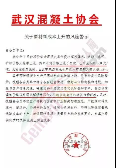 因全國(guó)水泥價(jià)格持續(xù)上漲,下游混凝土企業(yè)受影響比較大,但是這次跟以往最大的不同是各混凝土企業(yè)并不是像之前發(fā)布對(duì)漲價(jià)指責(zé)的函件,而只是輕描淡寫的發(fā)布了一些預(yù)警通知: