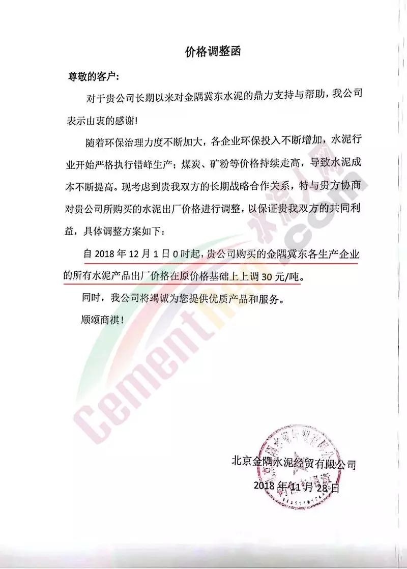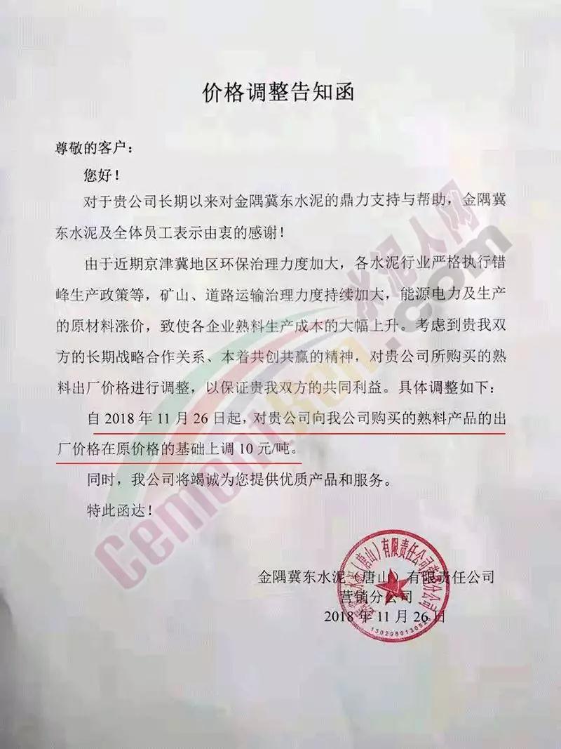 日前,華北地區(qū)主導(dǎo)企業(yè)金隅冀東水泥集中發(fā)布調(diào)價(jià)通知。其中,北京金隅經(jīng)貿(mào)有限公司調(diào)價(jià)通知稱,隨著環(huán)保治理力度不斷加大,各企業(yè)環(huán)保投入不斷增加,水泥行業(yè)開始嚴(yán)格執(zhí)行錯(cuò)峰生產(chǎn)。同時(shí),煤炭、礦粉等價(jià)格持續(xù)走高,導(dǎo)致水泥成本不斷提高。企業(yè)將于12月1日起上調(diào)各生產(chǎn)企業(yè)的所有水泥產(chǎn)品出廠價(jià)格,上調(diào)幅度30元/噸。