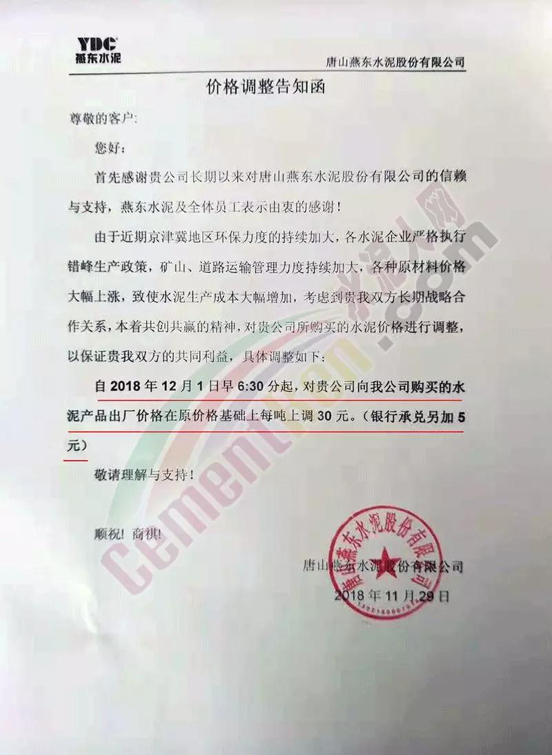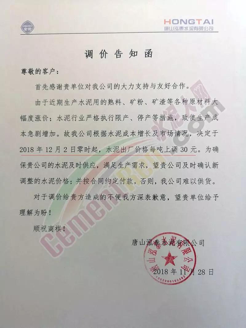 同期唐山燕東水泥,唐山泓泰水泥,六九水泥也跟隨發(fā)布了調(diào)價(jià)通知,稱自下月初起上調(diào)了水泥出廠價(jià)格,上調(diào)幅度30元/噸。