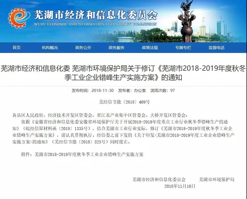 蕪湖市2018-2019年度秋冬季工業(yè)企業(yè)錯峰生產(chǎn)實施方案