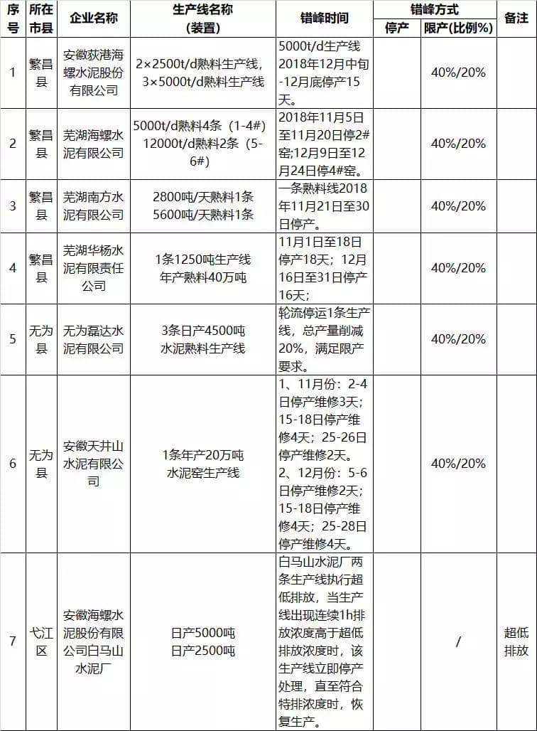 本方案實施時間為2018年11月16日至2019年2月28日。其中,2018年11月16日-2018年12月31日,各縣區(qū)、開發(fā)區(qū)對重點企業(yè)按照40%污染控制總量錯峰限產(chǎn)。2019年1月1日-2019年2月28日,各縣區(qū)、開發(fā)區(qū)對重點企業(yè)按照20%污染控制總量錯峰限產(chǎn)。錯峰生產(chǎn)方案納入全市涉氣企業(yè)總量消減工作范疇,如遇有重污染天氣,按照蕪湖市重污染天氣應(yīng)急管控預(yù)案限產(chǎn)執(zhí)行。