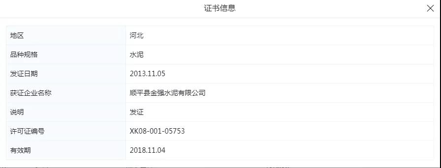 質(zhì)檢部局生產(chǎn)許可證辦公室相關(guān)數(shù)據(jù)顯示,順平縣金強(qiáng)水泥在2013年11月5日取得生產(chǎn)許可證,有效期至上月4日止。其產(chǎn)品明細(xì)為通用硅酸鹽水泥熟料。