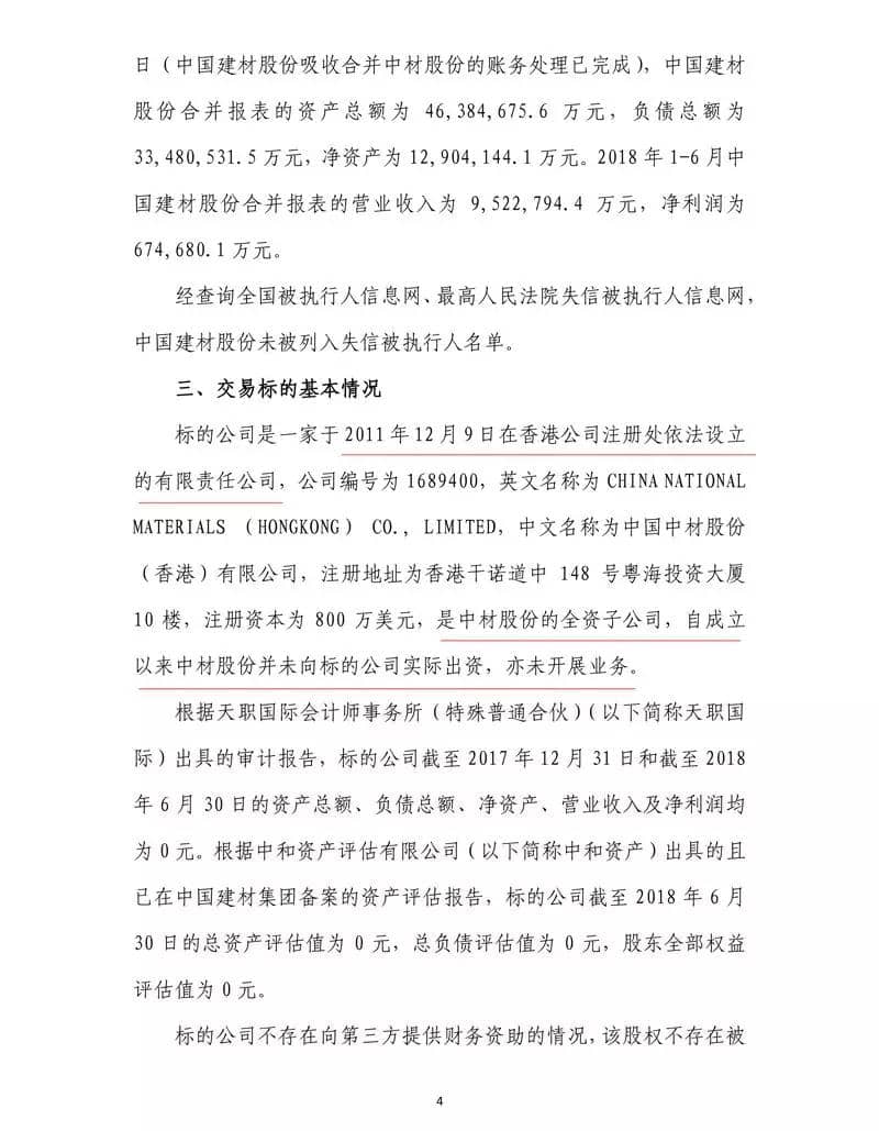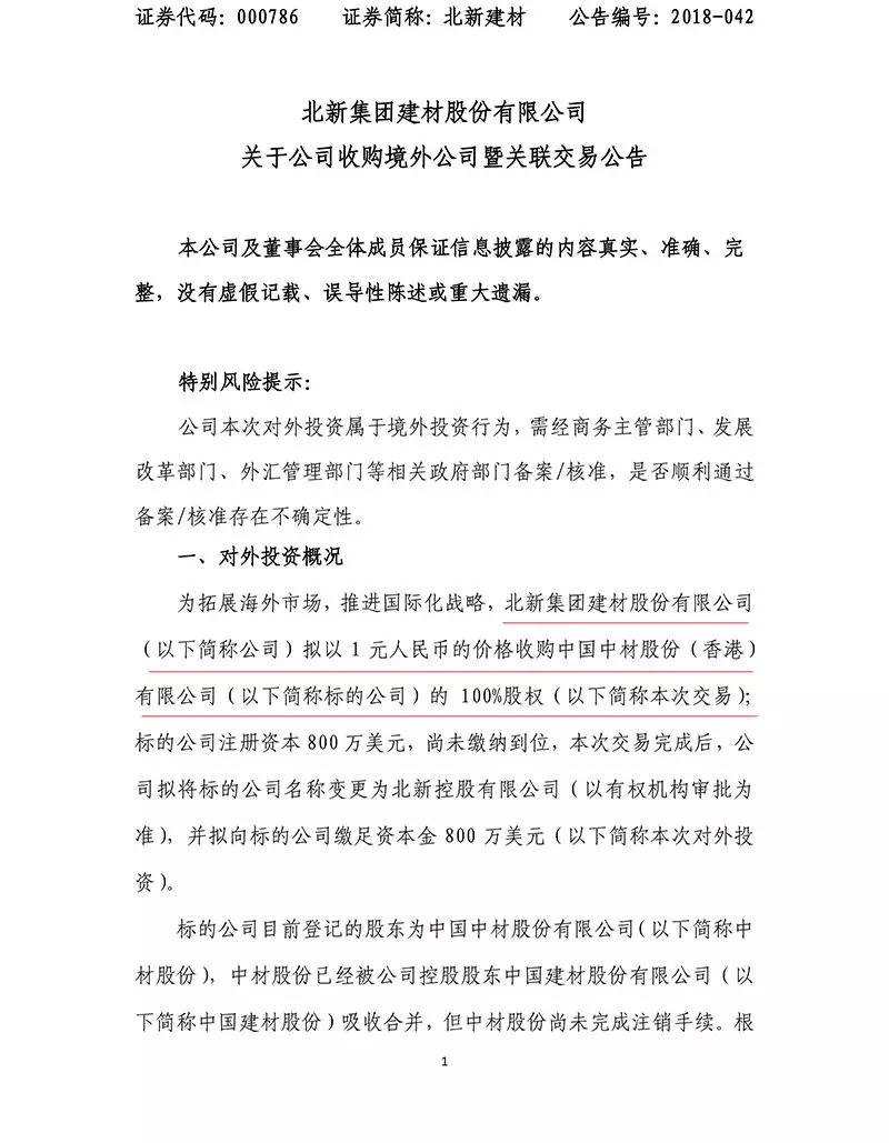 公告顯示,北新建材擬以1元人民幣的價(jià)格收購(gòu)中國(guó)中材股份(香港)有限公司(以下簡(jiǎn)稱標(biāo)的公司)100%股權(quán),交易完成后,標(biāo)的公司將成為公司全資子公司。