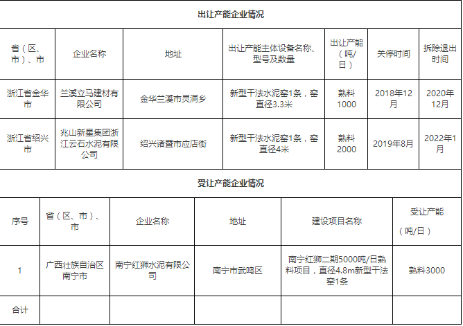 蘭溪立馬建材有限公司、兆山新星集團(tuán)浙江云石水泥有限公司熟料產(chǎn)能出讓公示