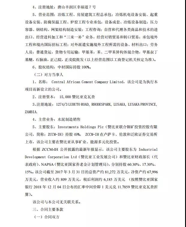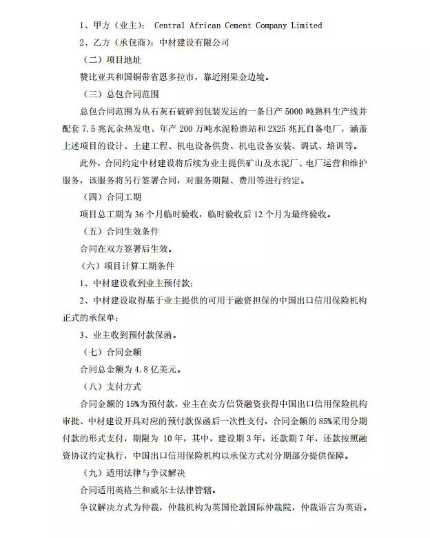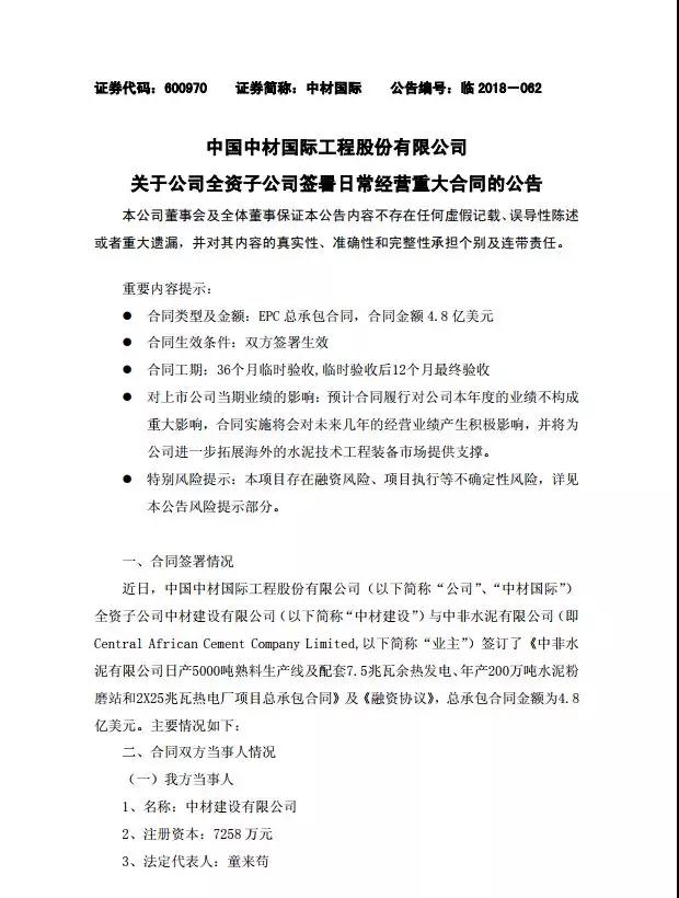 昨日(12月6日)上市公司中材國(guó)際(600970.sh)發(fā)布公告稱,旗下全資子公司中材建設(shè)有限公司(下稱“中材建設(shè)”)與中非水泥有限公司(即CentralAfricanCementCompanyLimited,下稱“業(yè)主")簽訂了《中非水泥有限公司日產(chǎn)5000噸水泥熟料生產(chǎn)線及配套7.5兆瓦余熱發(fā)電、年產(chǎn)200萬(wàn)噸水泥粉磨站和2X25兆瓦熱電廠項(xiàng)目總承包合同》及《融資協(xié)議》,總承包合同金額為4.8億美元。