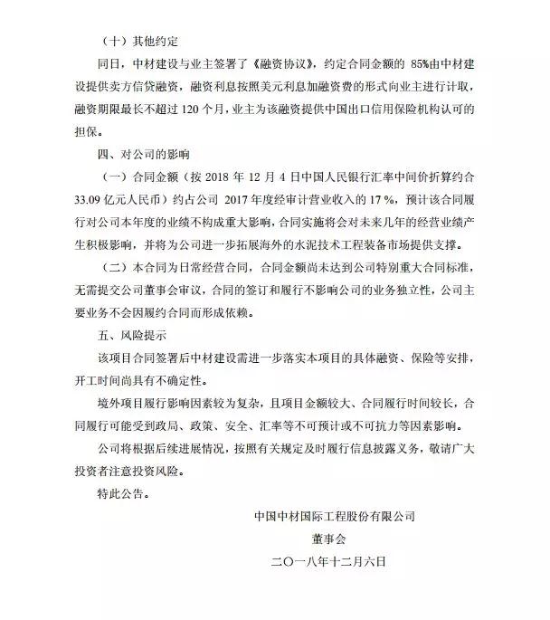 公告稱,合同還約定中材建設(shè)將后續(xù)為業(yè)主提供礦山及水泥廠、電廠運(yùn)營(yíng)和維護(hù)服務(wù),該服務(wù)將另行簽署合同,對(duì)服務(wù)期限、費(fèi)用等進(jìn)行約定。合同金額(按2018年12月4日中國(guó)人民銀行匯率中間價(jià)折算約合33.09億元人民幣)約占公司2017年度經(jīng)審計(jì)營(yíng)業(yè)收入的17%,預(yù)計(jì)該合同的實(shí)施將會(huì)對(duì)未來(lái)幾年的經(jīng)營(yíng)業(yè)績(jī)產(chǎn)生積極影響,并將為公司進(jìn)一步拓展海外的水泥技術(shù)工程裝備市場(chǎng)提供支撐。